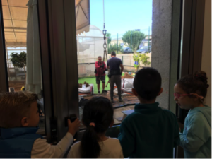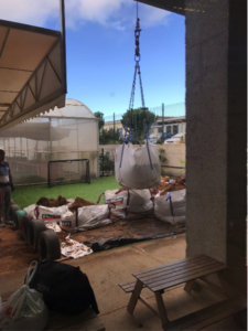 Mit großen Augen bestaunten die Kinder am Fenster, wie der Sand zunächst in mühevoller Arbeit abgeholt und abtransportiert wurde. Am folgenden Tag konnten sie dann beobachten, wie der neue Sand über das Vorschuldach zu Boden gelassen wurde. Die Vorfreude wuchs mit jedem Sandsack.