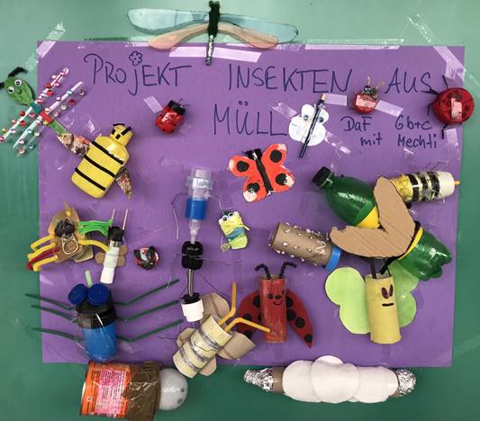 In den letzten Wochen hat die Klasse von Mechthild Mägdefrau in DaF an dem Thema „Umwelt braucht Schutz“ gearbeitet. Wir haben mit Müll tolle Insekten gemacht: wie zum Beispiel Bienen, Marienkäfer, Fliegen, Schmetterlinge, Spinnen…. Viele schöne Sachen hat die DaF Gruppe gemacht. Alle die Insekten sind aus Müll gemacht, Plastikflaschen, Papierrollen, Schnürsenkel und Pfeifenreinigern.