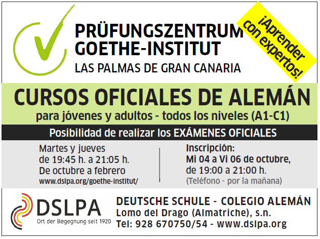 Seit 1956 gab es auf Gran Canaria ein Goethe-Institut, gegründet als Außenstelle des Goethe-Instituts Madrid und seit einigen Jahren zum Prüfungszentrum des Goethe-Instituts umgebildet. Seit der ersten Stunde war es in den Räumen der Deutschen Schule Las Palmas beheimatet. Das Prüfungszentrum setzt diese Tradition fort und bereitet seine Kursteilnehmer auf die offiziellen Prüfungen des Goethe- Instituts vor.
